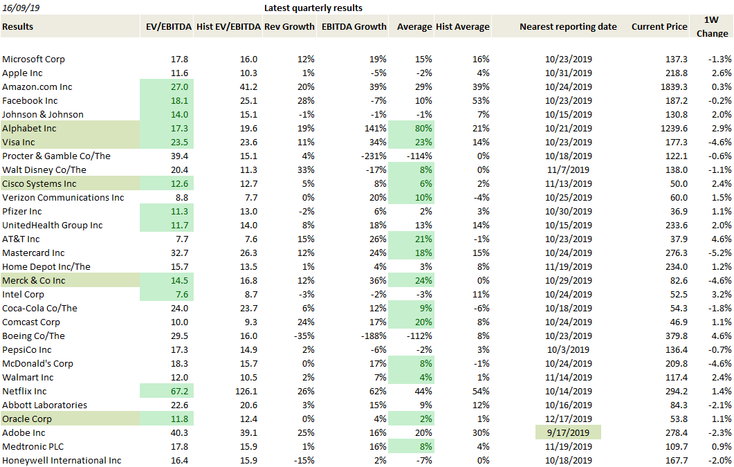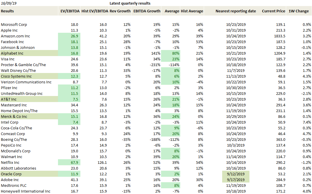Oracle: +1.1%. Oracle на неделе опубликовал неплохую квартальную отчетность: выручка не изменилась год к году, а EBITDA выросла на 4%. Таким образом, компания по-прежнему демонстрирует рост выше исторического (исторически — 1%) при мультипликаторе (11.8x) ниже исторического на уровне 75% перцентиля и остается в выборке