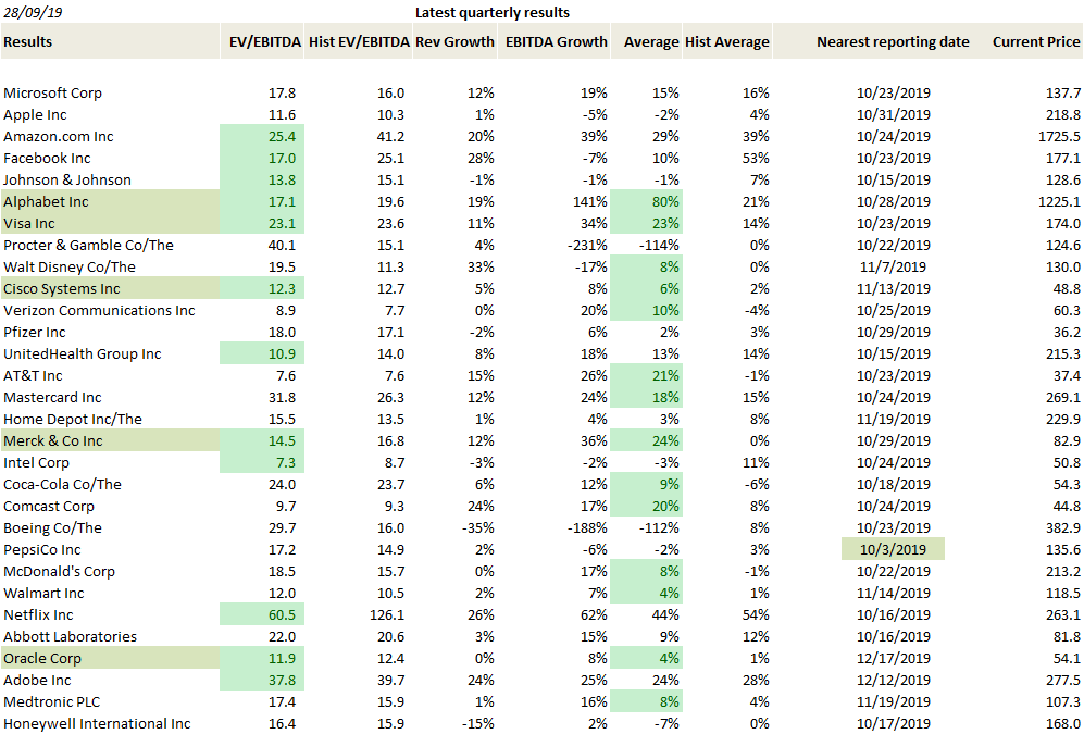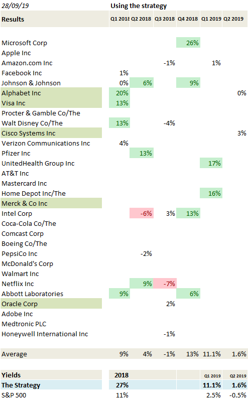 * Стратегия предполагает инвестирование непосредственно при выходе отчетности компаний в компании, по которым рост финансовых показателей оказывается выше исторического при том, что мультипликатор ниже исторического на уровне 75% перцентиля и закрытие открытых позиций по компаниям, по которым это условие не выполняется. Стратегия в базовом виде в целях минимизации комиссий не предполагает совершения сделок внутри кварталов, потенциально привлекательные для инвестирования компании на даты внутри квартала рассылаются справочно для инвесторов, желающих начать инвестирование между двумя финансовыми кварталами; справочно — по результатам отчетностей за 2й квартал покупки осуществились бы в отношении Alphabet и Cisco