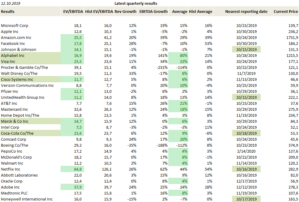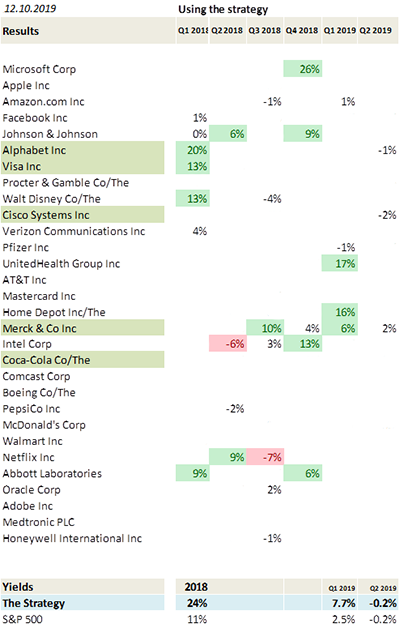 * стратегия предполагает инвестирование непосредственно при выходе отчетности компаний в компании, по которым рост финансовых показателей оказывается выше исторического при том, что мультипликатор ниже исторического на уровне 75% перцентиля и закрытие открытых позиций по компаниям, по которым это условие не выполняется. Стратегия в базовом виде в целях минимизации комиссий не предполагает совершения сделок внутри кварталов, потенциально привлекательные для инвестирования компании на даты внутри квартала рассылаются справочно для инвесторов, желающих начать инвестирование между двумя финансовыми кварталами; справочно - по результатам отчетностей за 2й квартал покупки осуществились бы в отношении Alphabet и Cisco