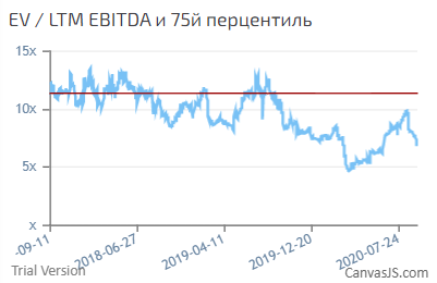 • Компания торгуется на уровне 6.9x по EV/EBITDA при историческом мультипликаторе (75% перцентиль) 11.4x